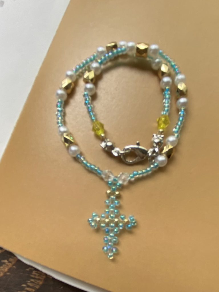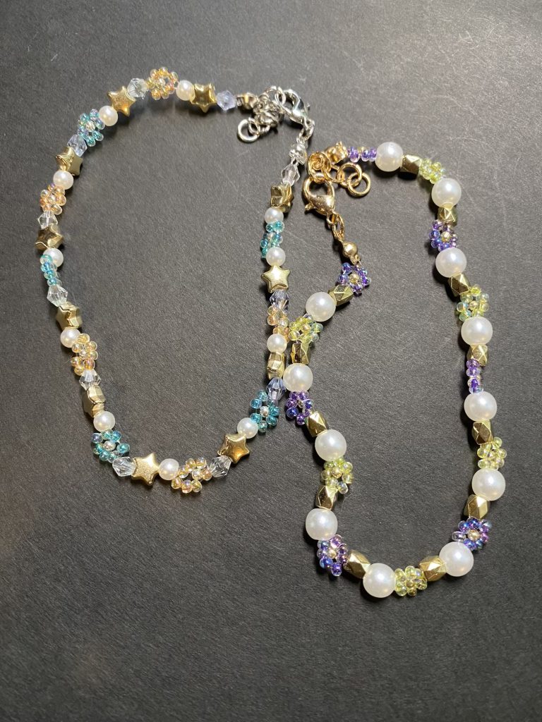 お花🌸モチーフのビーズアクセサリー作りにだいぶ慣れてきました😊先日作ったピンクのお花🌸ブレスレットを娘が気に入ってしまい取られてしまいました🤣☘️